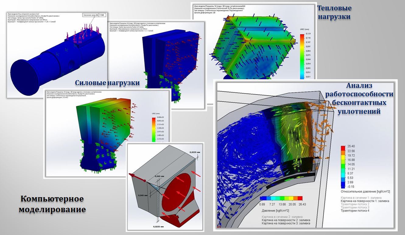 Проведено моделирование условий работы бесконтактных уплотнений, показавшее, что, благодаря высокой скорости лопасти (на порядок большей, чем скорость поршня в традиционном легковом двигателе), обеспечивается требуемая компрессия для обеспечения рабочего процесса и при этом потери на переток рабочих газов в смежные камеры составят не более 1,5% сжимаемого объема рабочих газов даже на холостых оборотах двигателя. С ростом оборотов эффект динамического сжатия будет усиливаться и потери на переток газов будут уменьшаться пропорционально росту скорости лопастей.